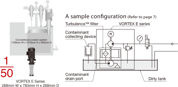 Vortex unit. No line and suction filters are required. The use of a Vortex unit reduces the required space to about 1/50th by volume of that occupied by a conventional coolant system. The saved space expands the available plant space, resulting in a higher production efficiency.