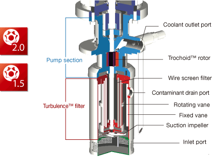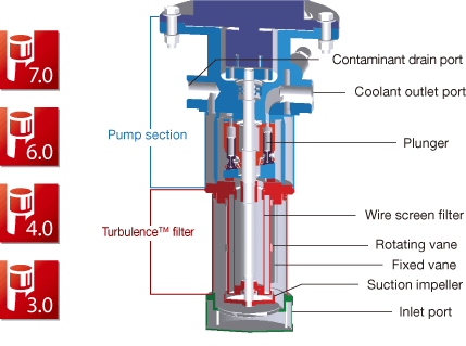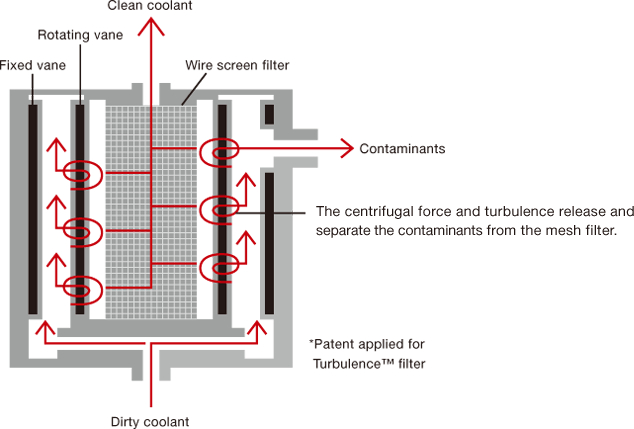Our special Turbulence™ design generates turbulence. The combined action of the turbulence and centrifugal force washes away chips from the filter automatically. The result is a maintenance-free unit with a stable high pressure and large flow rate. *Chips larger than 20μm in size removed (when using aqueous solution containing 2% or more water-soluble coolant fluid).