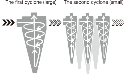 A proprietary double-cyclone filtering system removes chips*. The first and second cyclones remove relatively large and fine chips, respectively. The line-filter cleaning cycle is extended by 24 times.